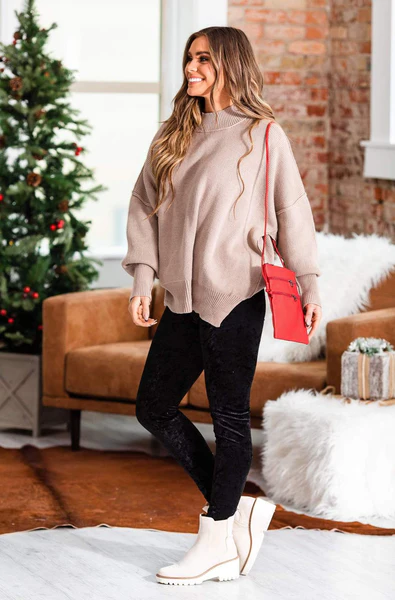 Add a plaid scarf or a Teddy coat for that cozy holiday flair. The key is balance — tight bottoms with voluminous tops. Whether you’re sipping cocoa or unwrapping gifts, this cozy and stylish combo gives you warmth, stretch, and just the right touch of sparkle.