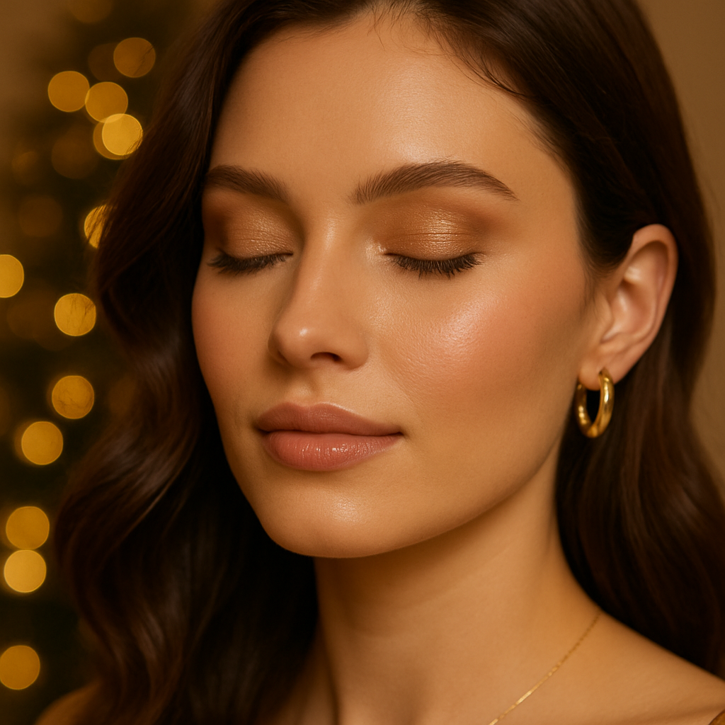 Pair your outfit with glowing skin, neutral eyeshadows, and a hint of rose or nude lips. The soft glam beauty trend is about enhancing, not masking — think radiant, not glittery. Add subtle highlighter to mimic the glow of Christmas candles.