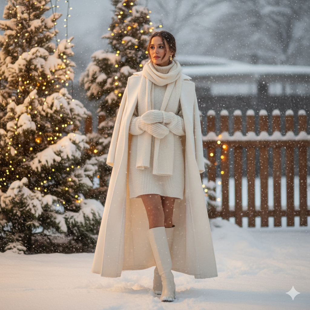 Head-to-toe monochrome in cream, champagne, or light grey creates a refined and cohesive aesthetic. Add layers like a matching coat or scarf for extra depth. Monochrome looks effortlessly stylish and photograph beautifully under holiday lights.
