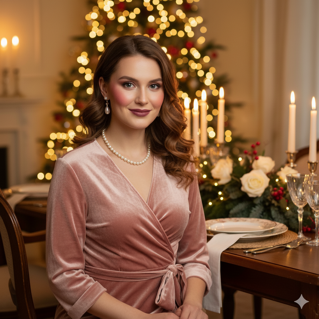 The 2025 Christmas dress code is “Cozy Glam” — think luxurious fabrics like velvet, sequins, or satin styled with warm layers and classic accessories.