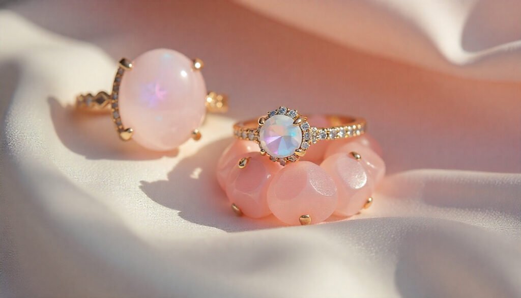 2025 loves stones that feel calm, romantic, and emotionally soothing—rose quartz, moonstone, opal, and baby-blue topaz.