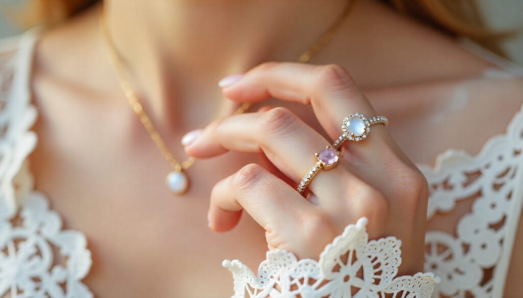 Choose dainty chains, pastel gemstone rings, small hoops, and delicate bracelets to create a soft-girl, Pinterest-ready aesthetic that feels warm and romantic.