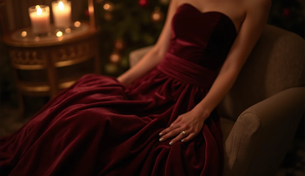 - Deep wine or emerald velvet dress