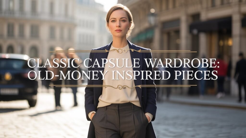 An old-money capsule wardrobe features timeless, high-quality pieces like tailored blazers, classic trousers, luxurious knits, and statement coats for a refined, minimalist style.