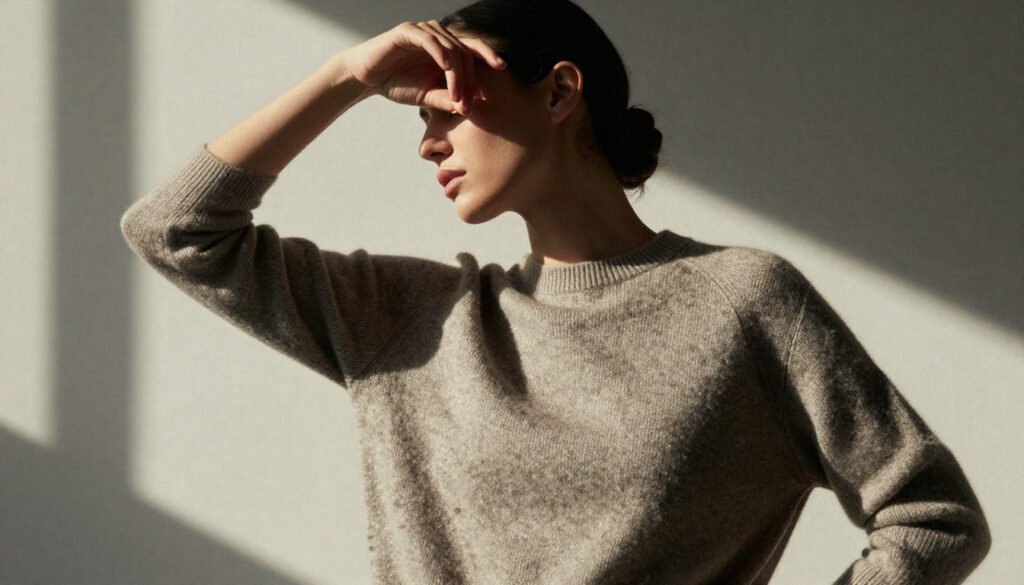 Neutral and muted tones—ivory, beige, soft grey, and navy—keep the look timeless and versatile. The tactile quality of cashmere and high-quality knits adds a subtle sense of luxury, while flowing silhouettes ensure comfort and graceful movement.