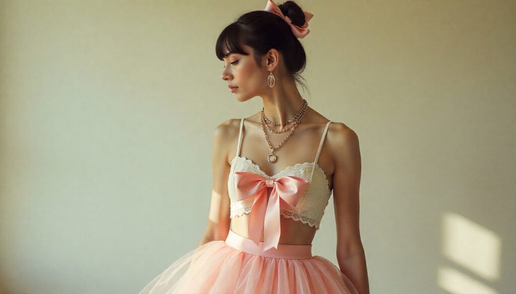 Accessories are where coquette outfits in 2026 truly become expressive. Delicate hair bows, pearl headbands, ribbon-tied ponytails, ballet flats, Mary Jane shoes, lace socks, mini handbags, and soft scarves complete the look without overpowering it. These pieces add charm while reinforcing the gentle femininity of the aesthetic.