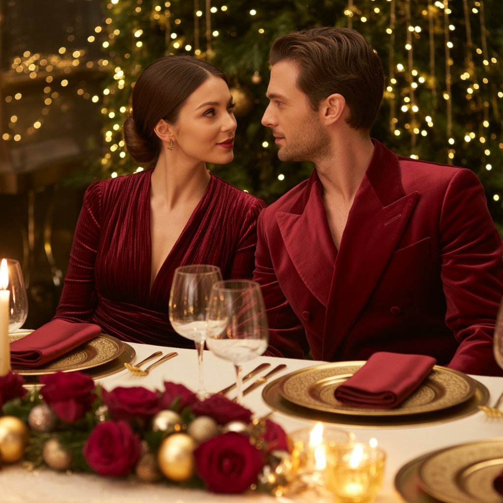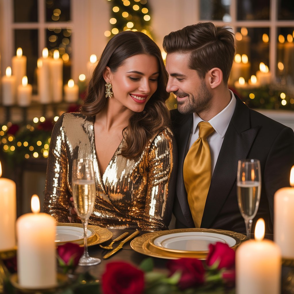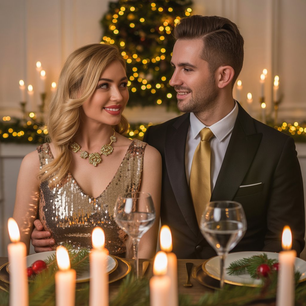 For Couple Christmas Outfit Ideas dinners or holiday events, go for elegant coordination — complementing colors or fabrics without being identical.