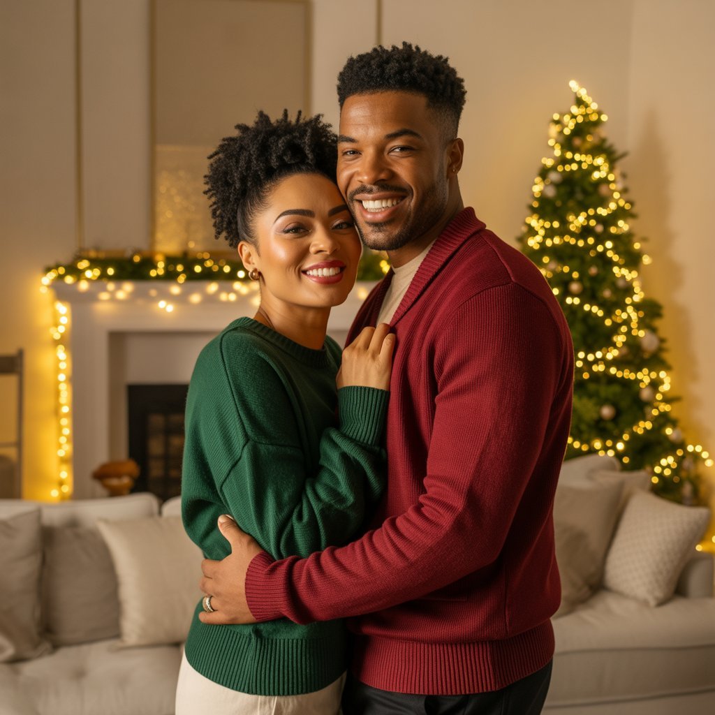 If you’re planning a Couple Christmas Outfit Ideas photoshoot, choose complementary outfits that tell your love story. Think flowy dresses, tailored blazers, or matching neutral outfits styled with festive props. Soft lighting, twinkling lights, and cozy textures make your couple shots magical.