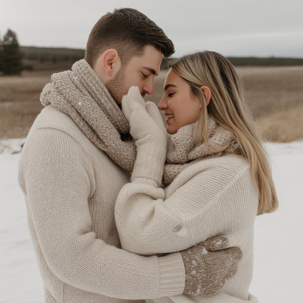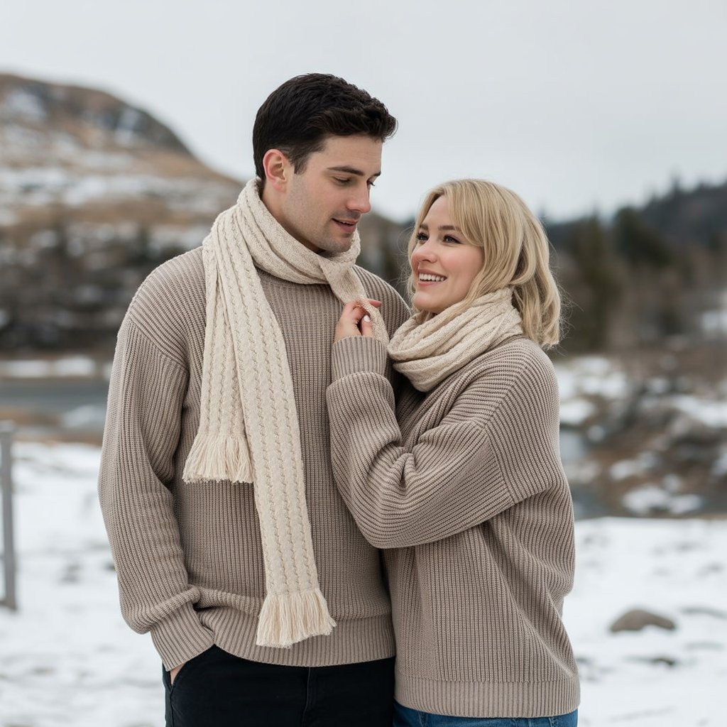 For couples who love simplicity, neutral-toned knitwear is the 2026 go-to. Think beige, cream, or gray sweaters paired with jeans, corduroy, or wool trousers.