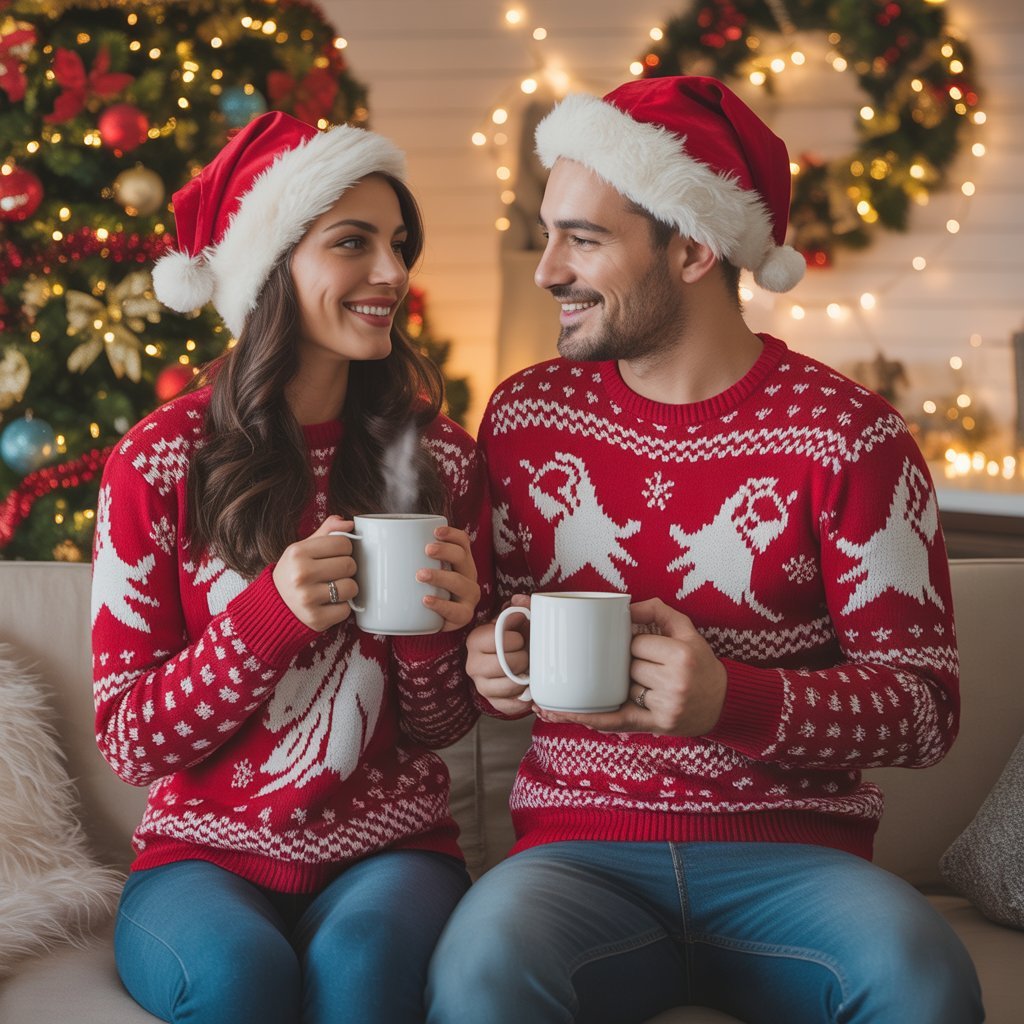Nothing says “Christmas couple goals” like matching holiday sweaters! Go for Fair Isle patterns, reindeer motifs, or minimal red-and-white designs. This timeless trend adds a playful yet cozy vibe — perfect for Christmas markets, holiday brunches, or casual photos by the tree.