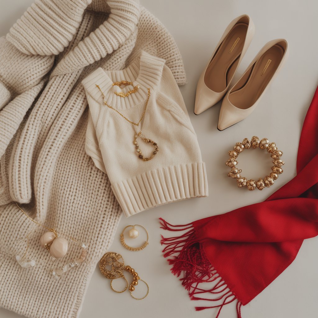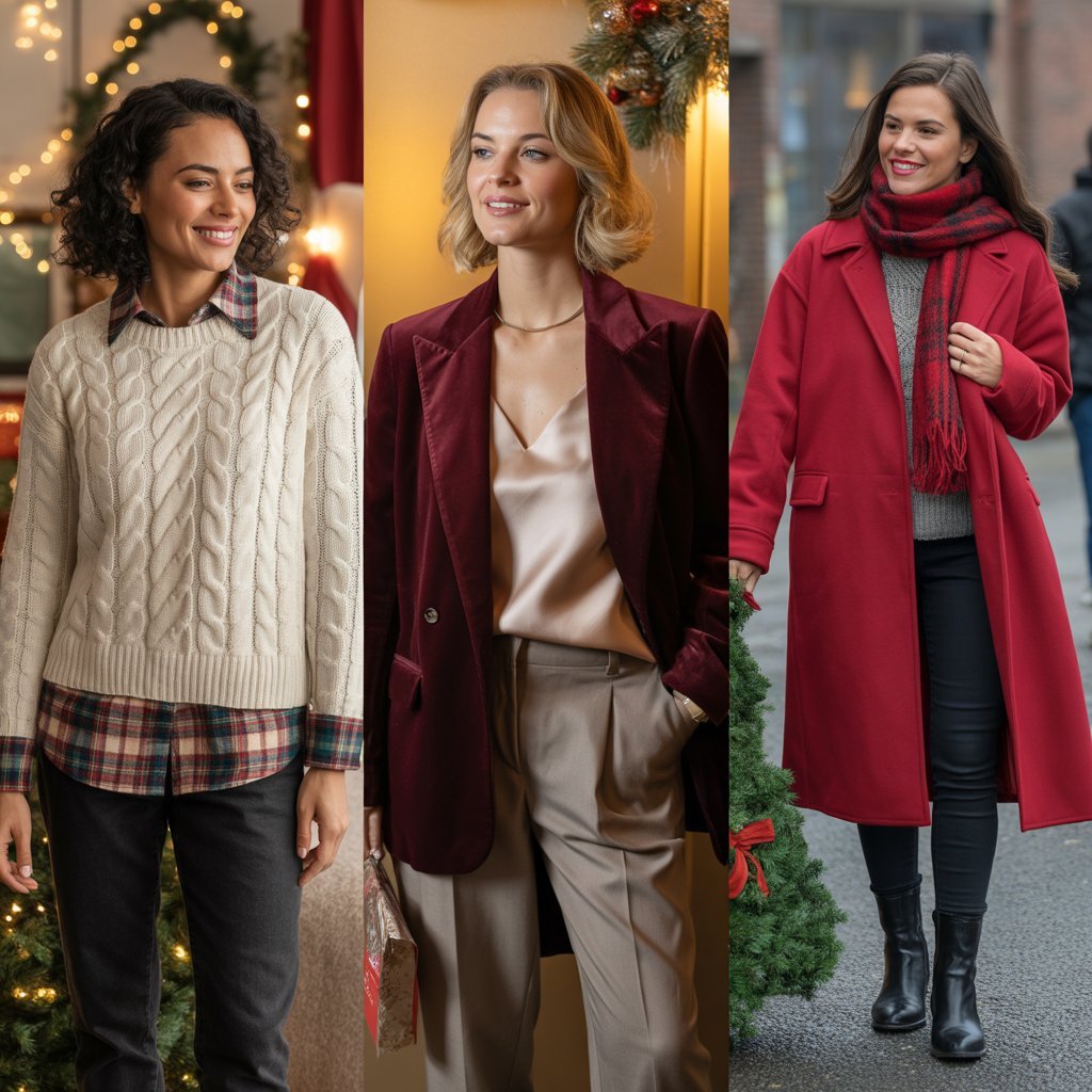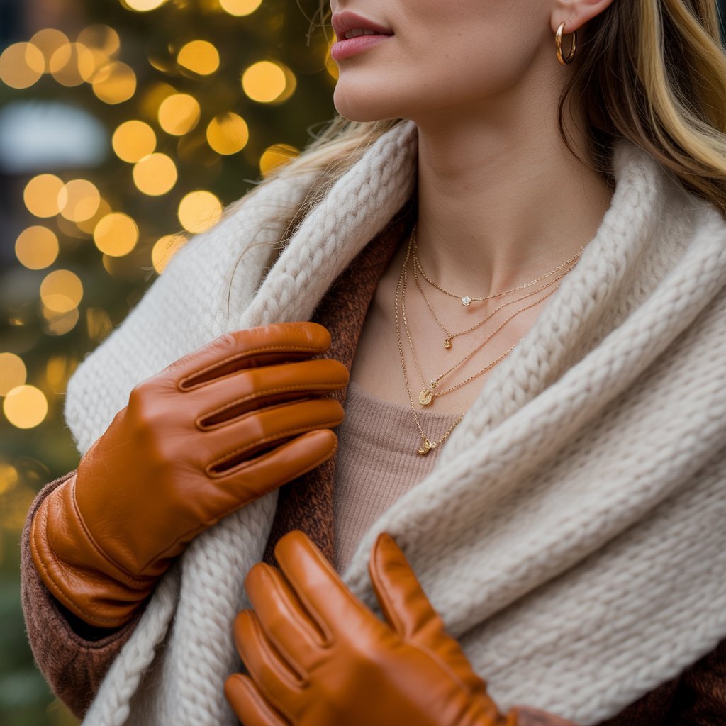 Accessories bring harmony to your layers. Add a silk scarf, statement gloves, and gold-tone jewelry for a refined finish. For a cozy holiday feel, incorporate soft textures like faux-fur collars or knit beanies.