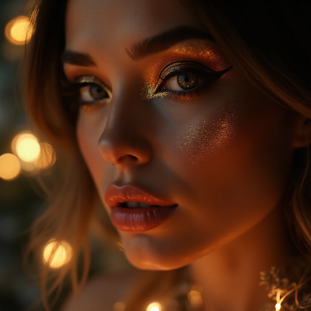Complete your glitter look with glowy skin, metallic eyeshadow, and glossy nude lips. Highlight your cheekbones and keep the rest of the makeup clean to balance the sparkle.