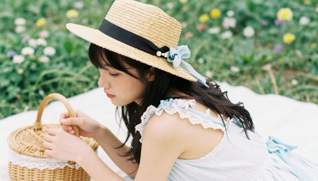 Think wide-brim straw hats, lace-trim socks, vintage-inspired sunglasses, pearl hair clips, and mini crossbody bags in pastel shades. Lightweight scarves tied around your ponytail or braided into your hair instantly elevate your soft-girl vibe. Picnic Outfits, And of course, a picnic isn’t complete without a cute wicker basket, even if it’s just for the aesthetics—it captures that dreamy, nature-loving energy perfectly.