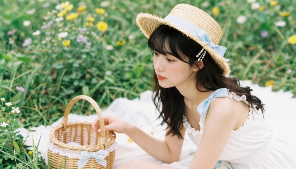 Choose airy fabrics, pastel colors, soft-girl hairstyles, and nature-inspired accessories like straw hats or wicker baskets. Capture your outfit in natural light with scenic outdoor backgrounds.