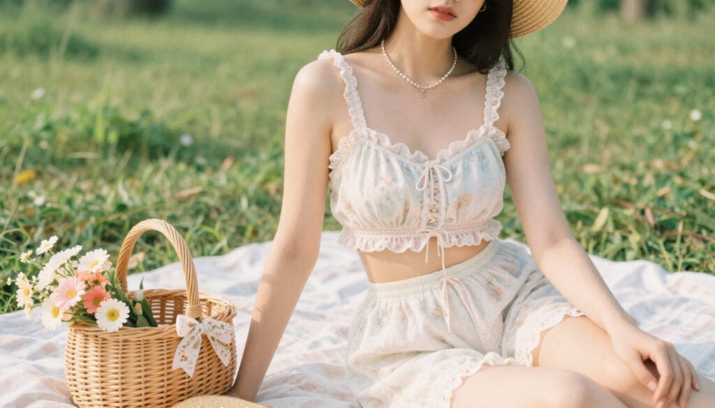 When the temperature cools down in the evening, layer your look with a thin knit cardigan, shrug, or pastel wrap. These light layers keep your outfit cozy without losing the girly, fairy-like vibe. Whether you’re sitting under a tree or posing in tall grass, airy fabrics make your entire picnic moment feel like a dreamy summer movie scene.