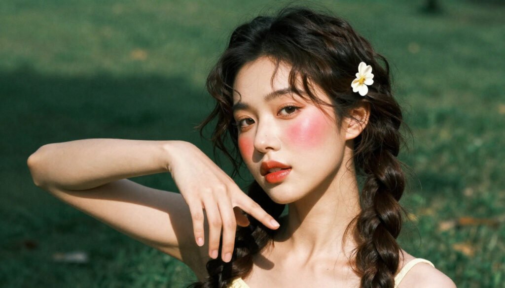 Makeup stays light and breathable—glowy skin, rosy cheeks, soft blush tones, subtle eyeliner, and glossy or tinted lips. The goal is to enhance your natural beauty, letting freckles show and skin glow under sunlight. This kind of makeup feels comfortable, emotional, and confident, especially for long outdoor hours.