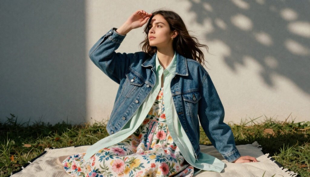 Picnic days often come with soft breezes and shifting sunlight, making light layering essential for 2026 picnic outfits. Think cropped cardigans, sheer shrugs, lightweight denim jackets, soft knit wraps, or airy cotton shirts worn open. These layers add warmth without heaviness, keeping your look soft, girly, and relaxed.