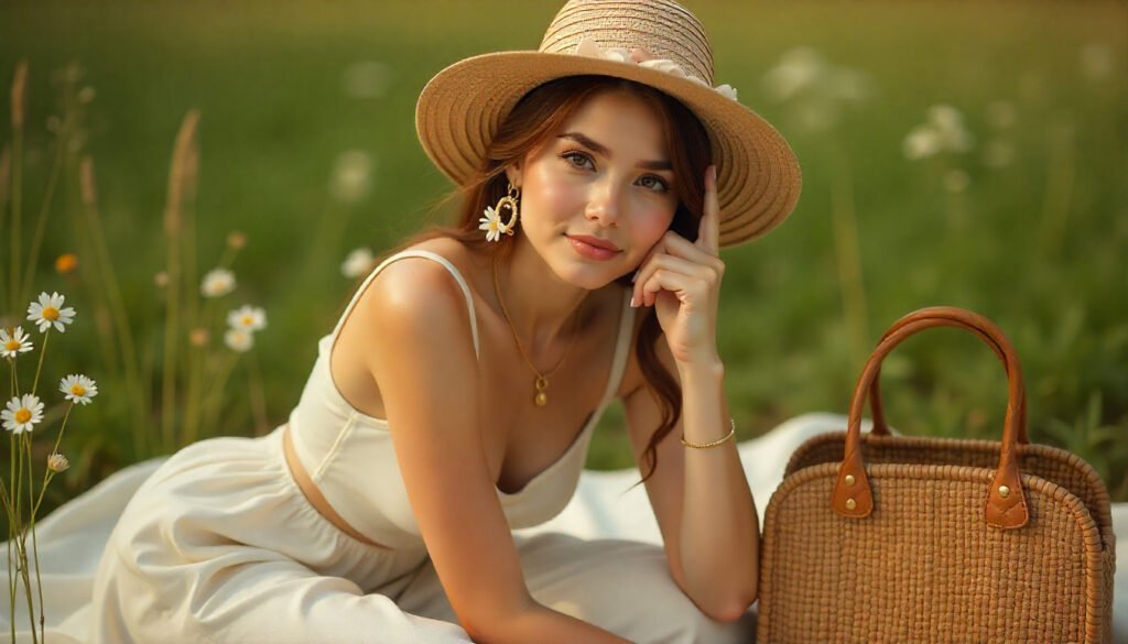 Lightweight accessories keep the outfit breathable and natural while enhancing femininity. A straw bag resting on a picnic blanket or a flower tucked into your hair instantly creates that dreamy, Pinterest-perfect aesthetic. These touches feel nostalgic, romantic, and emotionally comforting.