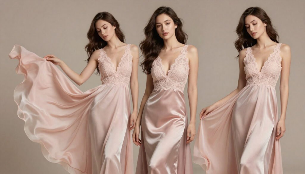 Blush pink, champagne, red, and soft neutrals enhance the fabric’s natural shine, making outfits look dreamy and elevated. Minimal accessories and delicate heels allow satin and silk pieces to remain the focus, highlighting femininity through simplicity.