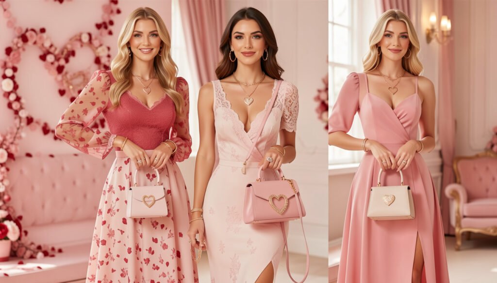 Accessories are the finishing touch that turns a Valentine’s Day outfit into a memorable aesthetic moment. Delicate jewelry, heart-shaped details, soft handbags, and strappy heels add romance without overpowering the look. The goal is subtle sparkle and intentional softness.