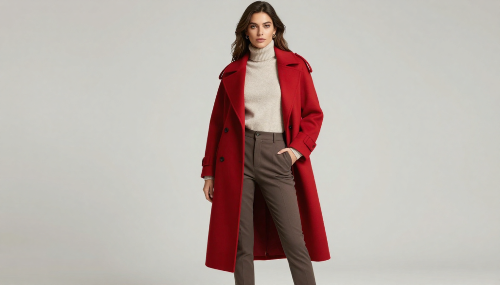 To style red outerwear flawlessly, keep the base outfit simple and clean. Monochrome foundations in black, white, nude, or gray allow the red piece to shine. Accessories should be minimal—think gold hoops, sleek boots, or a structured bag. The result is an outfit that feels bold yet balanced, strong yet feminine. Red layering isn’t just fashion—it’s a statement of self-belief, authority, and fearless style.
