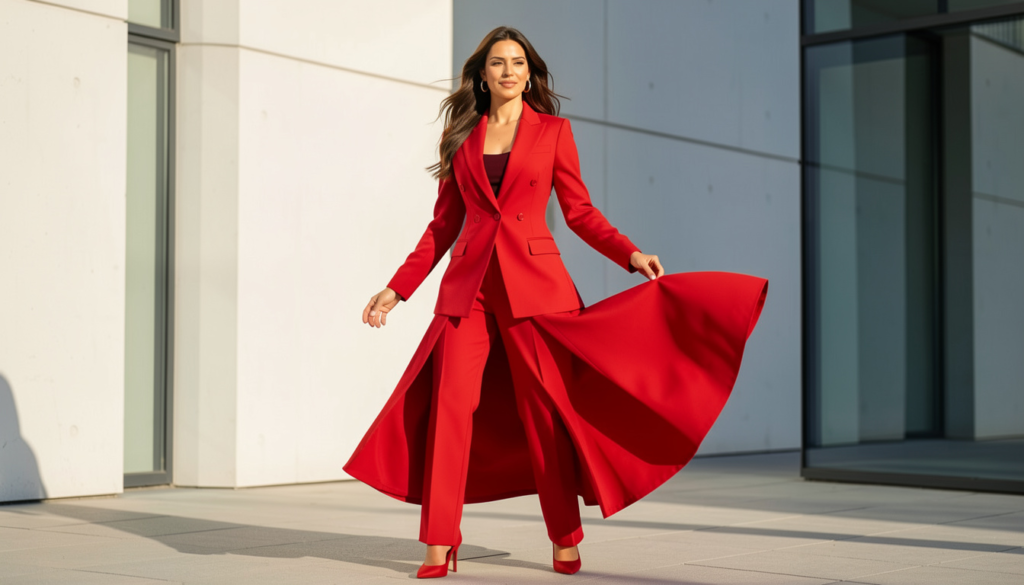 For curvy and hourglass figures, wrap dresses, belted red blazers, and body-skimming midi dresses enhance natural curves without feeling restrictive. Structured tailoring adds elegance while soft fabrics keep the look sensual and comfortable. Petite women shine in monochrome red outfits, high-waisted red trousers, or short red dresses that elongate the legs and create a taller visual line. Keeping proportions clean helps red feel polished instead of overpowering.
