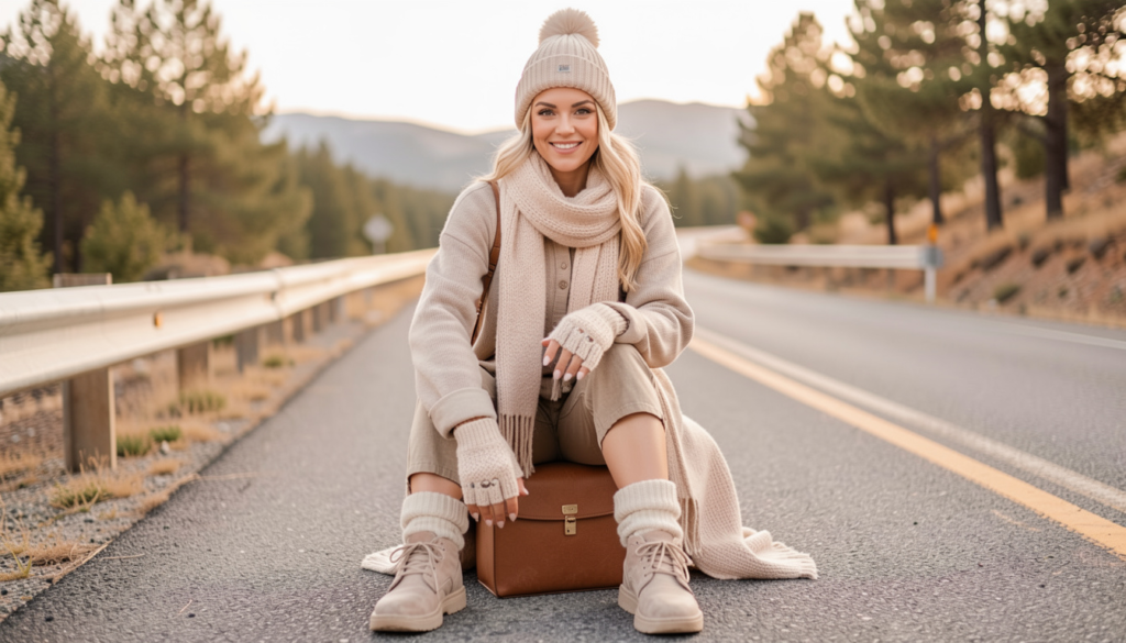 Cozy accessories are the secret to taking road trip outfits from simple to Pinterest-perfect. Think soft knit scarves, beanies, oversized socks, fingerless gloves, and lightweight wraps. These pieces add warmth, texture, and personality to your look while keeping you comfortable during long hours in the car or chilly stops along the way.