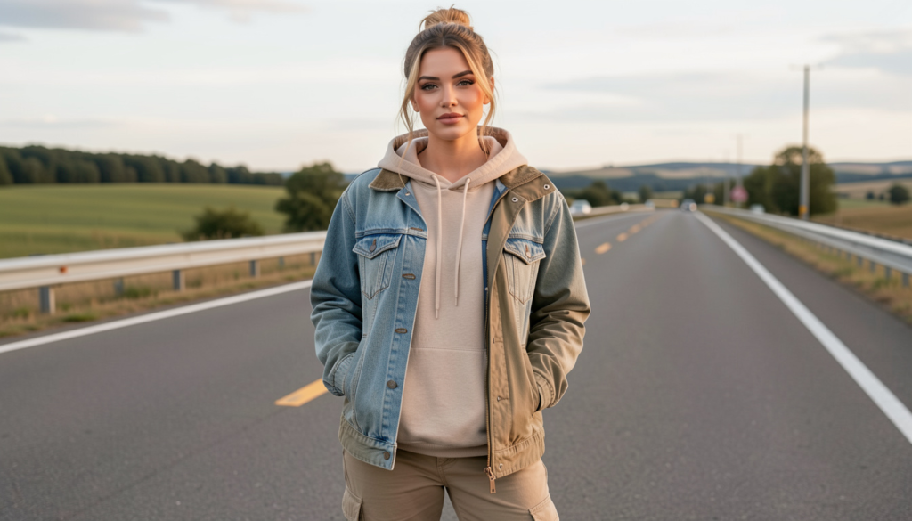 Weather can shift quickly on a road trip, which is why easy outerwear is a must for cute and cozy travel outfits. Lightweight jackets, denim layers, cropped windbreakers, oversized hoodies, and soft shackets provide just the right amount of warmth without feeling bulky. These pieces are easy to take on and off, making them perfect for car travel.