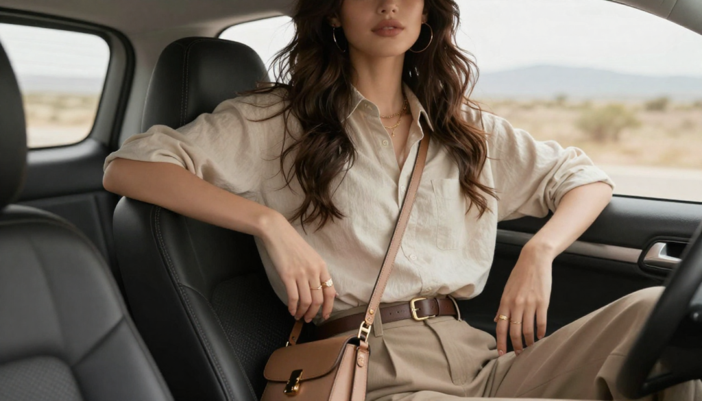 Neutral-toned bags and accessories blend seamlessly with cozy outfits, while subtle textures like canvas, leather, or knit details elevate the overall aesthetic. Sunglasses and caps aren’t just stylish—they add comfort and protection during long sunny drives, making them must-haves for car-ready fashion.