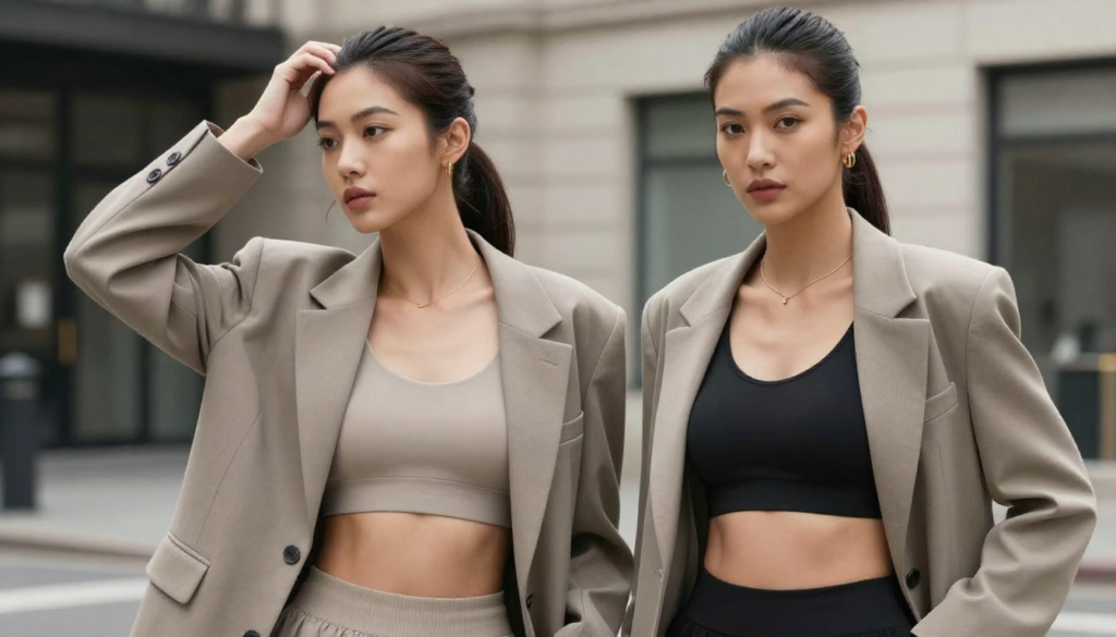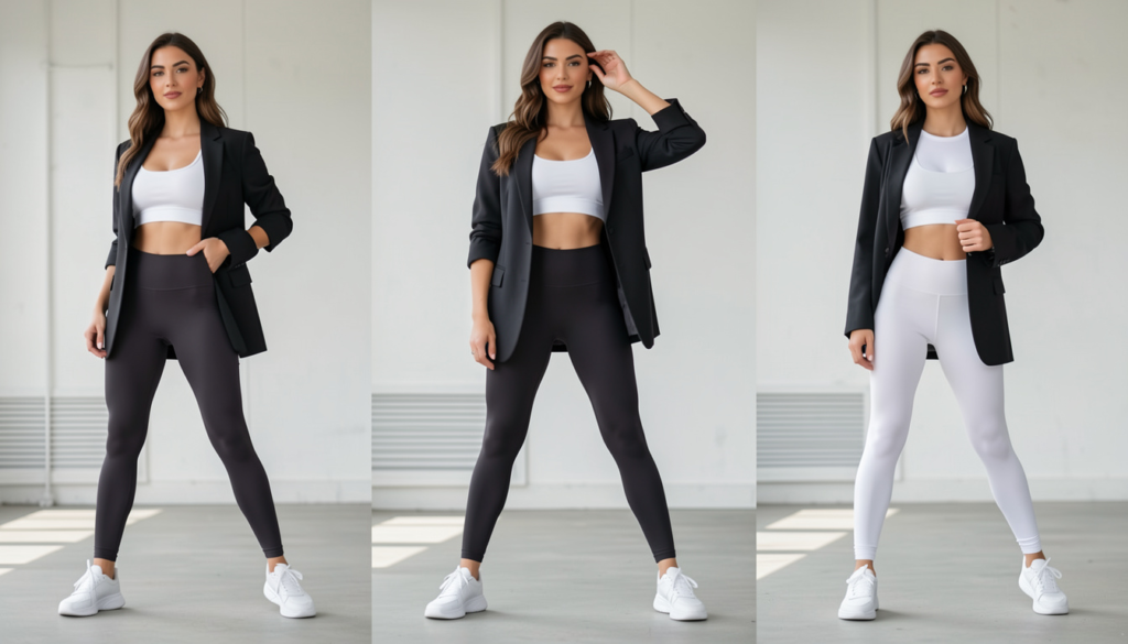 Combine soft fabrics like leggings or crop tops with tailored jackets or blazers. Neutral colors and clean lines make the look cohesive and fashionable.