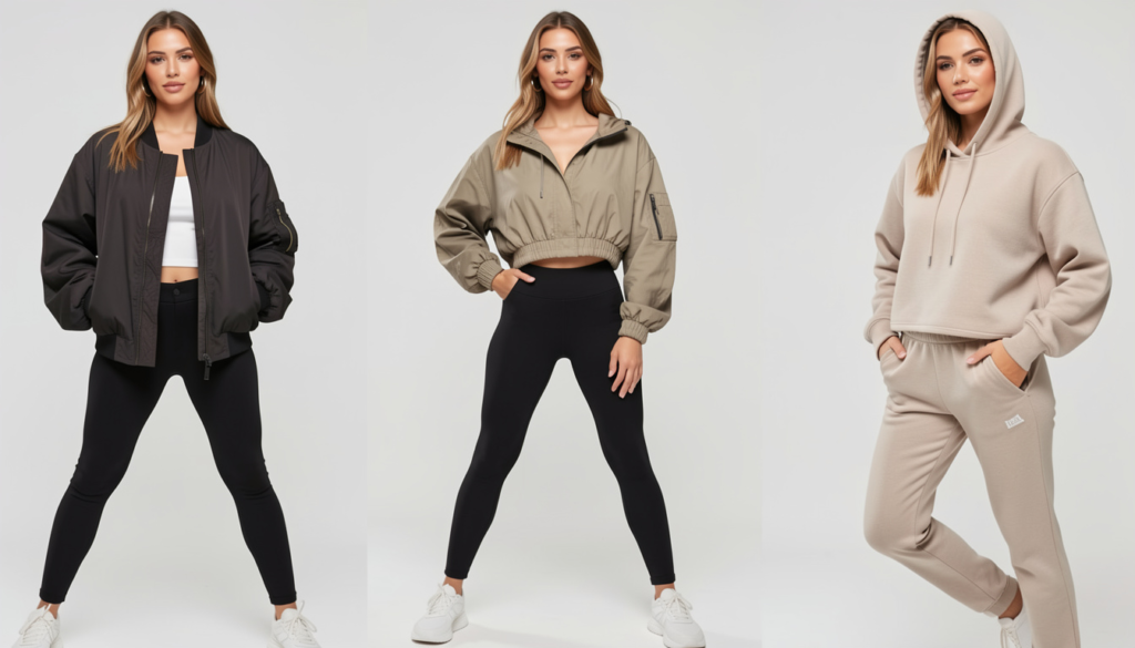 Matching athleisure sets are the heart of sporty-chic outfits, offering instant style with zero effort. Coordinated leggings and crop tops, ribbed bike-short sets, or soft jogger-and-hoodie combos create a clean, intentional look while keeping comfort at the center. In 2026, these sets are designed with flattering cuts, breathable fabrics, and subtle shaping that enhance confidence.
